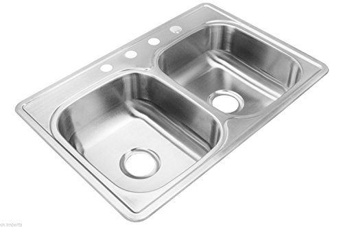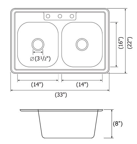 FIREBIRD 33″x22″ T-304 STAINLESS STEEL TOP MOUNT DROP IN 50/50 DOUBLE BOWL 8″ DEPTH PREMIUM HEAVY GAUGE KITCHEN SINK