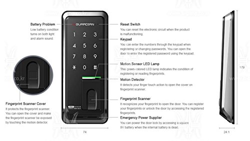 Thinner and More Elegant! This fingerpr’nt door lock is designed to be thinner and more elegant than other ordinary optical fingerprint recognition door locks by using finger-print scanning method. It is the (finest fingerprint door lock harmonious with every type of frztmt (tutu, Auto Cover Safely Protects Fingerprint Scanner from Contamination! The auto cover protects the fngerprint scanner for faster and morestabieuseofdooriochienyoutoudwthegreen sensor, the fingerprint module is woken up and provides the best mgle for scaming your fingerprints