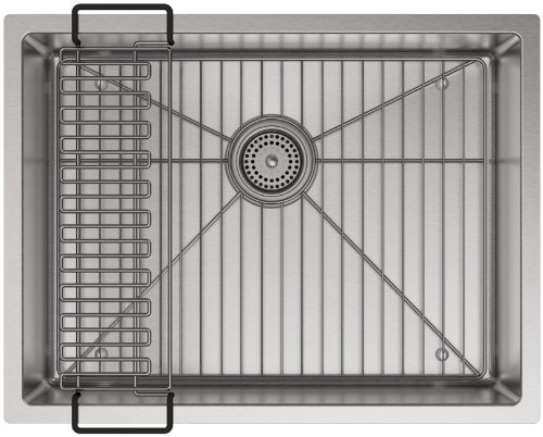 This Strive kitchen sink offers professional style with easy-to-clean curved corners. Made of thick, premium quality 16-gauge stainless steel, the medium-sized single bowl allows you to soak and clean large cookware and bake ware. Strive features a sound-absorption system that significantly reduces disposal and dishwashing noise. This sink includes a combination dishcloth bar and utility shelf to organize dishcloths, scrubbers and sponges and a bottom basin rack to help prevent scratches.
