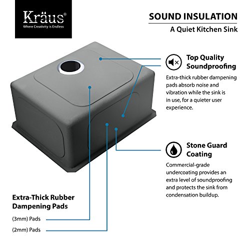 Kraus handmade stainless steel sinks combine fashion with function to create a contemporary look for the kitchen. Handcrafted from premium 16 gauge T-304 stainless steel for maximum durability, the extra-deep basins accommodate large dishes with ease. The tight-radius corners and clean lines of the design complement transitional and modern kitchens alike. All Kraus kitchen sinks are equipped with top-level soundproofing, including thick rubber dampening pads. Each sink is additionally treated with protective Stone Guard coating, which reduces condensation and further dampens sound. The corrosion-resistant surface is further protected from rust and oxidation by a meticulous finishing process. Commercial-grade satin finish and rounded corners make maintenance as simple as wiping the surface with a damp cloth. This stylish single bowl sink provides a lifetime of functionality. For added convenience, a basket strainer drain assembly and stainless steel bottom grid are included free with purchase. Each bottom grid is cushioned by soft protective bumpers to prevent scratching. For easy installation, all mounting hardware is provided. Experience Kraus Quality and bring your kitchen ideas to life.