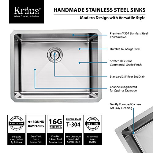 Kraus handmade stainless steel sinks combine fashion with function to create a contemporary look for the kitchen. Handcrafted from premium 16 gauge T-304 stainless steel for maximum durability, the extra-deep basins accommodate l…