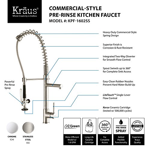 The best kitchen ideas start with great design. Kraus commercial style faucets feature a unique industrial aesthetic that creates a dramatic look with contemporary appeal. Each best selling faucet is constructed with certified lead-free brass and top-quality components, including a high performance / low flow Neoperl aerator and a precision Kerox ceramic cartridge for reliable drip-free use. With a choice of flawless commercial grade stainless steel or chrome finish, this faucet matches many popular fixtures and appliances, resulting in a beautifully coordinated look for your kitchen. For flexible functionality, this ultra modern faucet has a pull-down spray head and side pot filler. Single-hole mounting allows the faucet to integrate seamlessly with your sink. For easy installation, all mounting hardware is provided. Experience Kraus Quality and bring your best kitchen ideas to life.