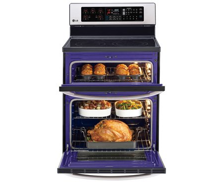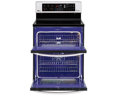 The LG LDE3037ST 30 In. Freestanding Electric Double Oven with Infrared Grill Broiler, in stainless steel, not only gives you two impressive, completely separate ovens to cook in, but also features an infrared grill broiler that gives you the ability to grill foods year round, so you can have the taste of summer even in the dead of winter. The two ovens have capacities of 2. 3 cu. ft. and 4. 4 cu. ft. – easily enough to hold dishes meant for large family dinners or holiday meals. This combined with 5, easy-to-clean radiant cooktops, gives you the options to cook pretty much any meal you can come up with. Other helpful features include the WideView window (perfect for checking on cooking foods without opening the oven doors), the GoCook oven light, and 12 hour automatic shutoff.