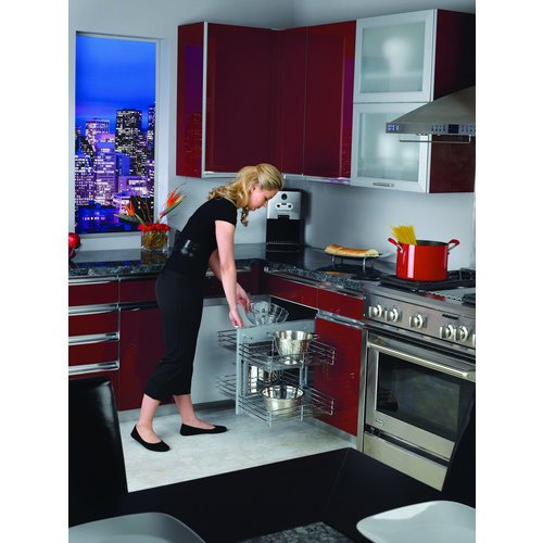 This Non-Handed 5PSP Series maximizes space in blind corner cabinets while allowing the user full accessibility to the entire unit. The unit is easy to assemble and now installs for either left or right-handed applications. This chrome blind corner optimizer fits most 45 blind corner cabinets and features chrome accents, ball bearing slides, and heavy-duty materials making it functional, reliable and stylish. Bring organization to your fingertips, with the 5PSP Series and see how Rev-A-Shelf is changing the way you think about cabinet organization. Shipping Dimensions 26-1/4″ Width, 20-1/4″ Depth, 21″ Height.