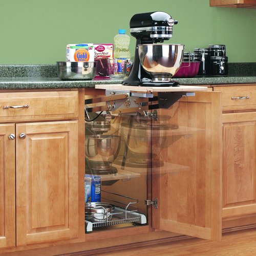 With design flexibility in mind, the heavy-duty chrome mixer lift can be attached to any custom made shelf allowing a perfect match to your counter top or interior cabinet. Revered as the “best in the industry”, the RAS-ML-HDCR features built-in shock dampeners, adjustable spring tension and holds appliances up to 60 lbs. The heavy-duty chrome mixer lift must be installed in a full-height cabinet with NO drawer above. It will NOT work in a cabinet with a drawer. The lift system can be used with many different cabinet widths with a minimum base cabinet frame opening of 12-1/2 inches. To determine shelf size measure the distance between mounting plates when installed minus 1-1/4 inches. Mounting plates are 1 inch W. Recommended length of shelf is a minimum of 20-1/2 inches. Please note that a 20-1/2 inch or larger cabinet length/depth is required to accommodate this minimum recommended shelf length of 20-1/2 inches. Instructions, hardware, and left and right lifting arms Included. Shelf and Mixer NOT included.