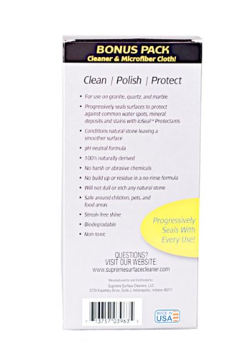 Supreme Surface Granite & Quartz Cleaner with ioSeal Protectants is a nontoxic, biodegradable treatment that effectively works on all natural stone surfaces. ioSeal brings a whole new technology to cleaning granite, quartz, marble, and other natural stones. It ionically bonds a protective barrier to the stones surface, every time you clean. It conditions the surface making colors more vibrant, surfaces smoother and more reflective. It helps prevent limescale buildup, hard water sports, stains, UV rays fading countertops and more. All this without wax and includes a free, high quality, full size microfiber towel!