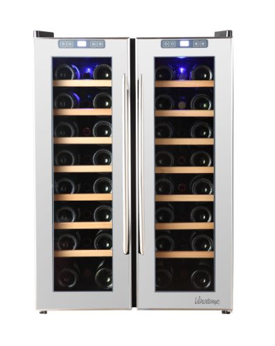 The sleek 48-Bottle Dual-Zone Mirrored Wine Cooler allows you to accurately control the temperature of your wine with two independent temperature controlled zones for red and white wine. A quiet thermo-electric cooling system protects your bottles from unnecessary vibration. Thermoelectric cooling is not only good for your valuable wine collection but also for the environment. Using absolutely no ozone depleting chemicals such as CFCs or HCFCs you will be sure that you are doing your part to preserve the environment. This state of the art cooler features dual-pane glass windows, a technology that has been proven in the construction industry. They have better insulation properties, better UV protection, and are easier to clean. This energy efficiency will lead to less electricity usage and savings in energy bills throughout the years. This cooler features a black cabinet, mirrored trim doors, and elegant pole handles, making it a must-have for the wine lover with an eye for style. Vinotemp’s exclusive Mirrored Wine Coolers combine modern cooling technology with high style and are a fun alternative to traditional stainless steel.